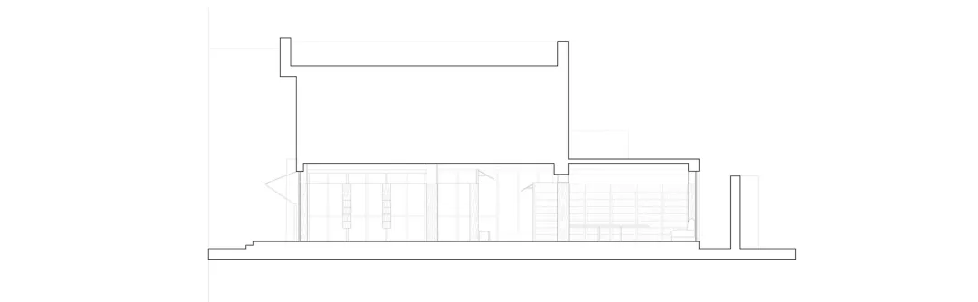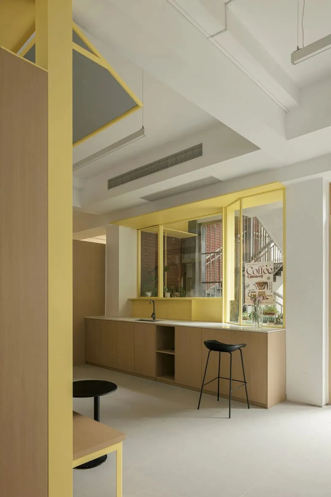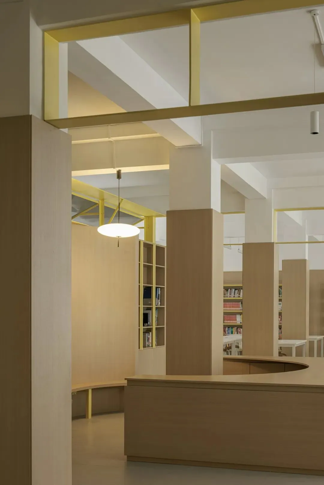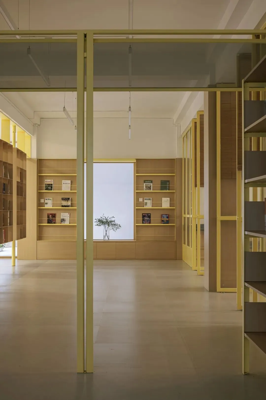 真实性,也体现在对剖面尺度的控制上。空调设备布置的区域,我们顺势压低吊顶,在局部营造出强烈的包裹感。而大部分空间则裸露梁柱,以达成开阔效果。室内大面积采用木作书架不做装饰。包裹柱子的木饰面控制在一个高度线,不与楼板和梁柱相接,以醒目的黄色钢架作为过渡。“不贴顶”的处理在垂直方向上拉开了清晰的视觉层次,凸显轻质“插件系统”与老建筑主体之间相互独立的真实关系。
