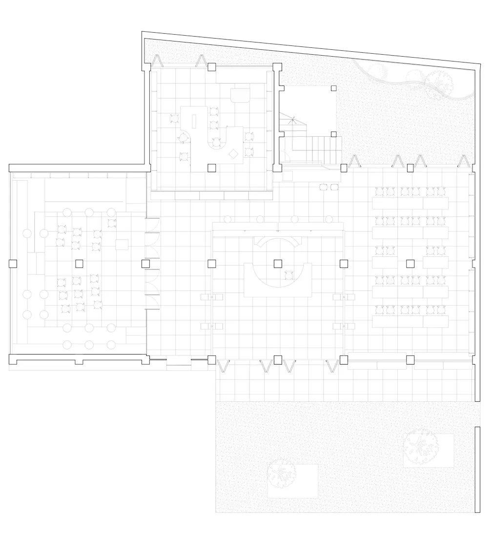 在入口处的灵活读书区,旋转书架会成为了改变空间状态的动态“机关”。当书架完全打开时,图书室就像一个向四周延展的广场,偏转的组件打破了老建筑原本刻板的正交秩序,带来灵活地漫游体验;而当需要分区使用时,书架又能闭合并切分空间,有效保障两侧功能区的独立性。