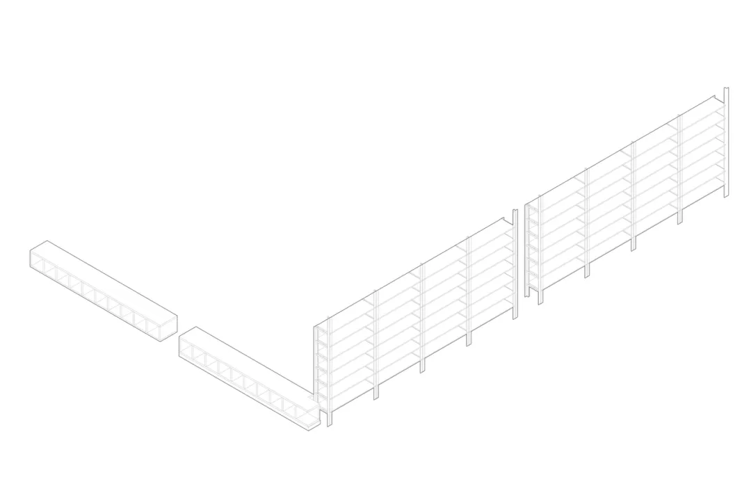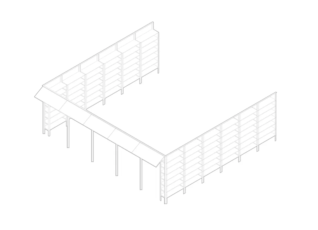 建构系统由内向外延展。在保留原有建筑立面结构的前提下,底层边界被最大程度的打开。外设的可开合雨棚,将内部插件骨架的阵列感延续至室外。原本封闭、沉闷的老旧底层,形成一个相对通透、欢迎的界面,也最大限度地将成都珍贵的阳光引入了室内。