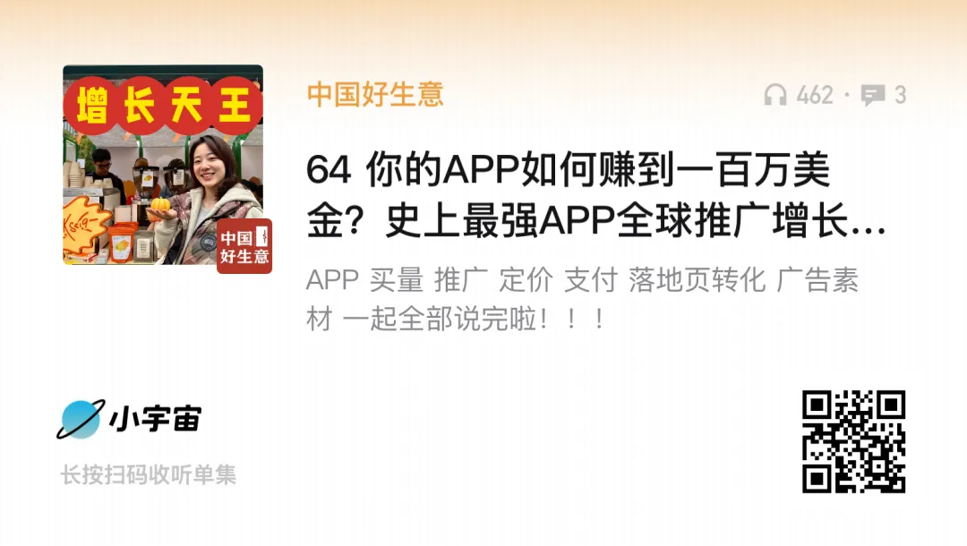 Eve:其实我一般都是很旺的,很多朋友跟我在一块,我们会在见面的时候刚开始聊,然后聊到一半,他们就发现收到了 TS 或者钱突然到账了,或者审核通过了,我经常 bring 这个东西出来。树杨:好,那我们现在就开始。我们觉得未来最不值钱的可能就是做一个 APP 了,但最难的可能是怎么把 APP 给卖出去。那么我今天就请了我身边卖 APP 最专业的同学 Eve,他之前是在谷歌做增长的,这样他既有平台的视角,然后他自己又创办了一家帮助工具类 APP 出海发行的公司——你的产品够好,然后他出钱,他帮你买流量,然后钱对半分,你也不用出钱,这应该是全国第一类这种公司。其实今天呢,我也抱着私心的,因为我们播客是我很好的社交平台,所以我们产品也快上线了,而且 Eve 他觉得可能我们产品还特别有意思——至少我们花了可能一百多一点点做的产品是别人七百多万美金做不出来的(笑)。然后我们也是借这个播客这个名义才能约到他。那么我们现在就开始,首先请 Eve 介绍下自己。