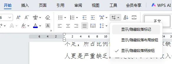 1.在开始栏下,勾选显示/隐藏编辑标记,将会显示显示 段落标记、分页符、分节符。
