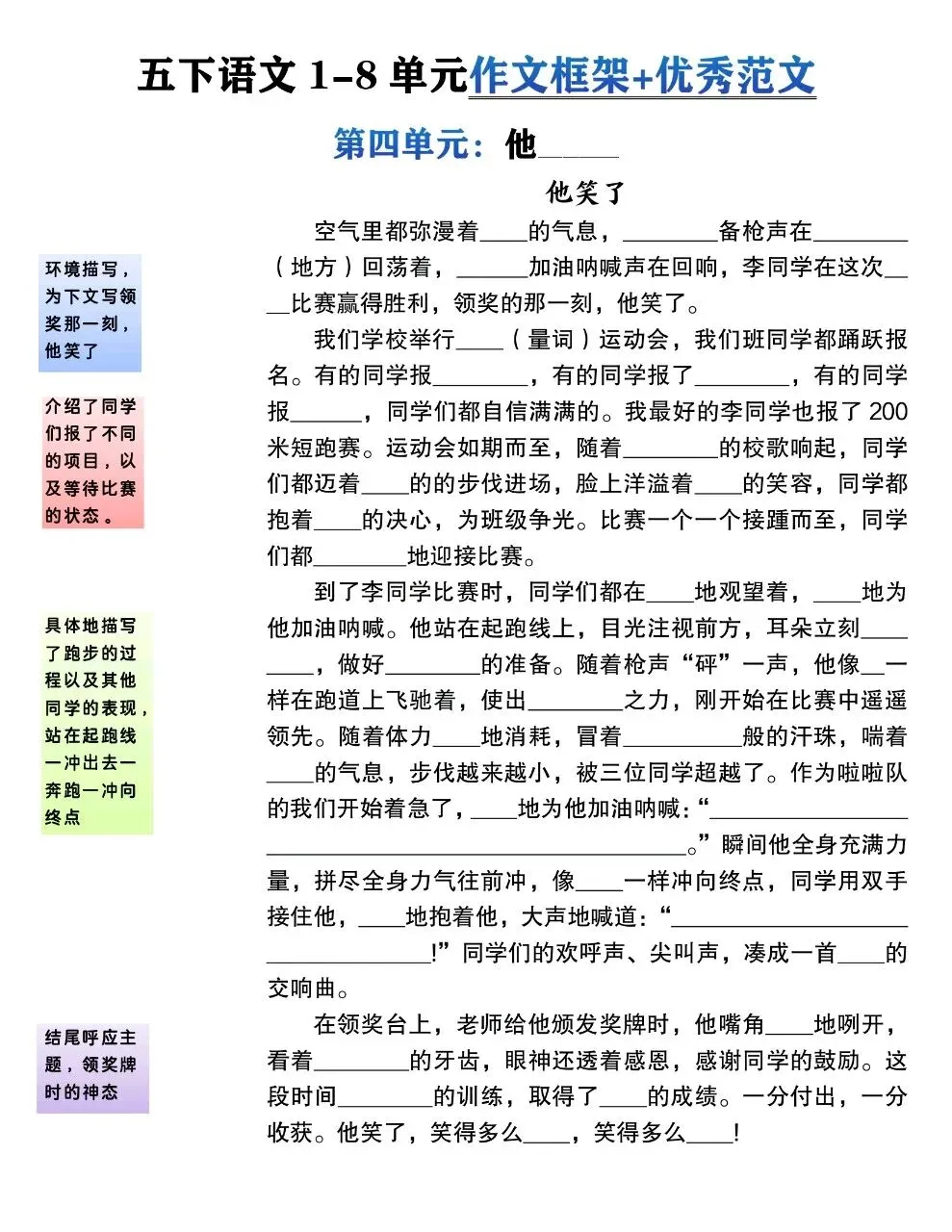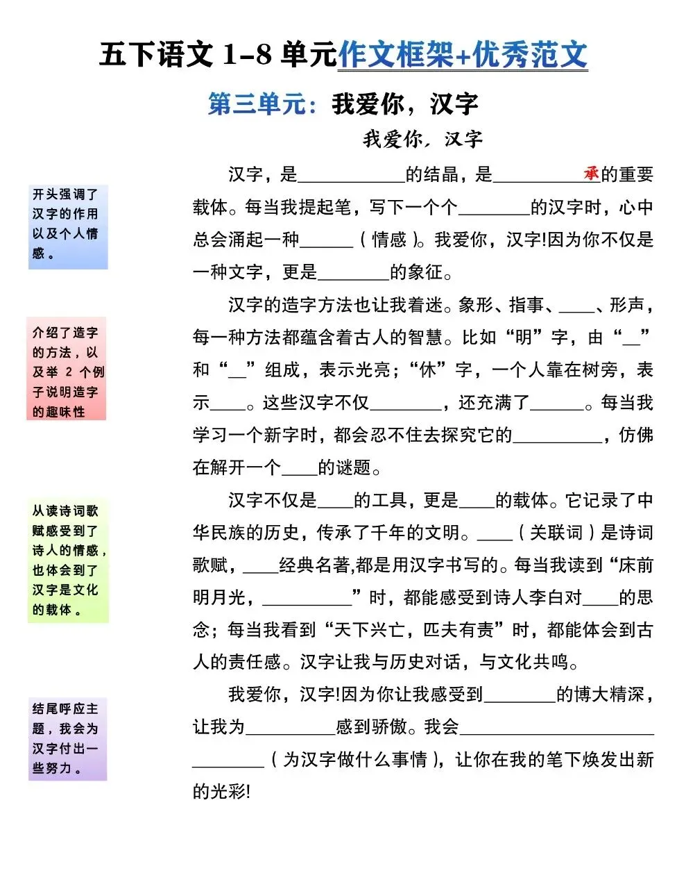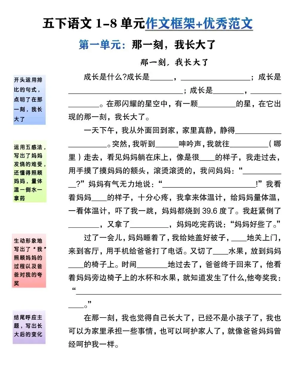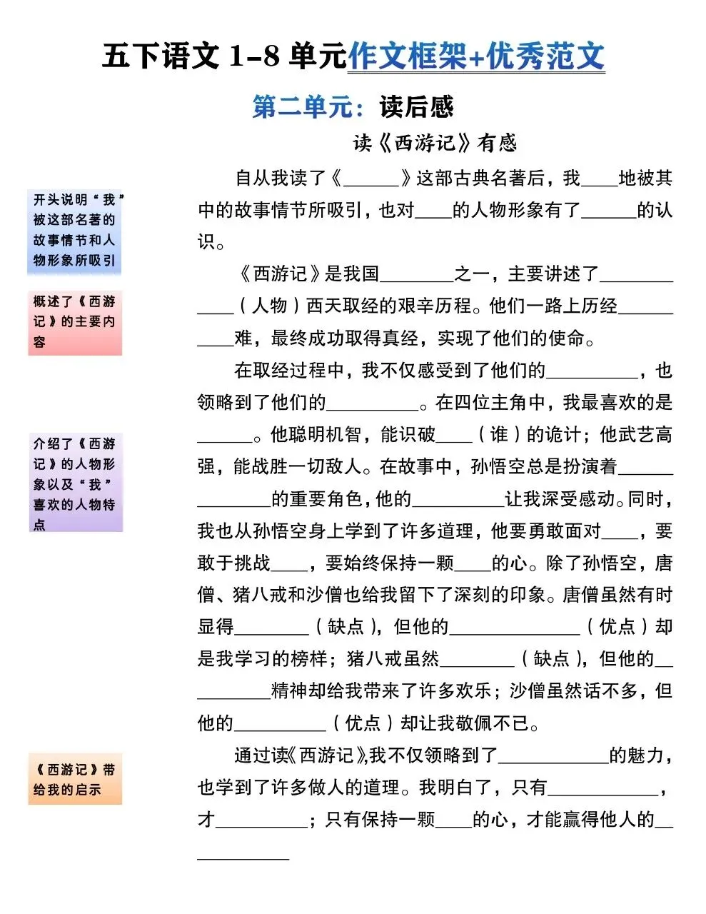 五年级下册语文|作文框架+优秀范文(可下载打印) 小学资料每日更新,具体看完整PDF版本 (温馨提示:文末👇有完整电子版下载🔗) 新版五年级下册语文 作文框架+优秀范文 包含成长感悟、读后感、说明文、写人、叙事、探险、文化遗产、漫画启示等常考主题,每篇都有写作框架、段落模板、好词好句、完整范文,直接套用就能写,适合单元习作和考场作文。 △因篇幅有限,只展示部分资料截图△ ↓↓↓ 领取完整电子版: ①:点一点右下角的“👍”和“❤️”,感谢🙏 ②:在公众号对话框回复:1061 小学同步学语文 资料合集:👇👇 小学学习方法 五年级下册数学 五年级下册英语