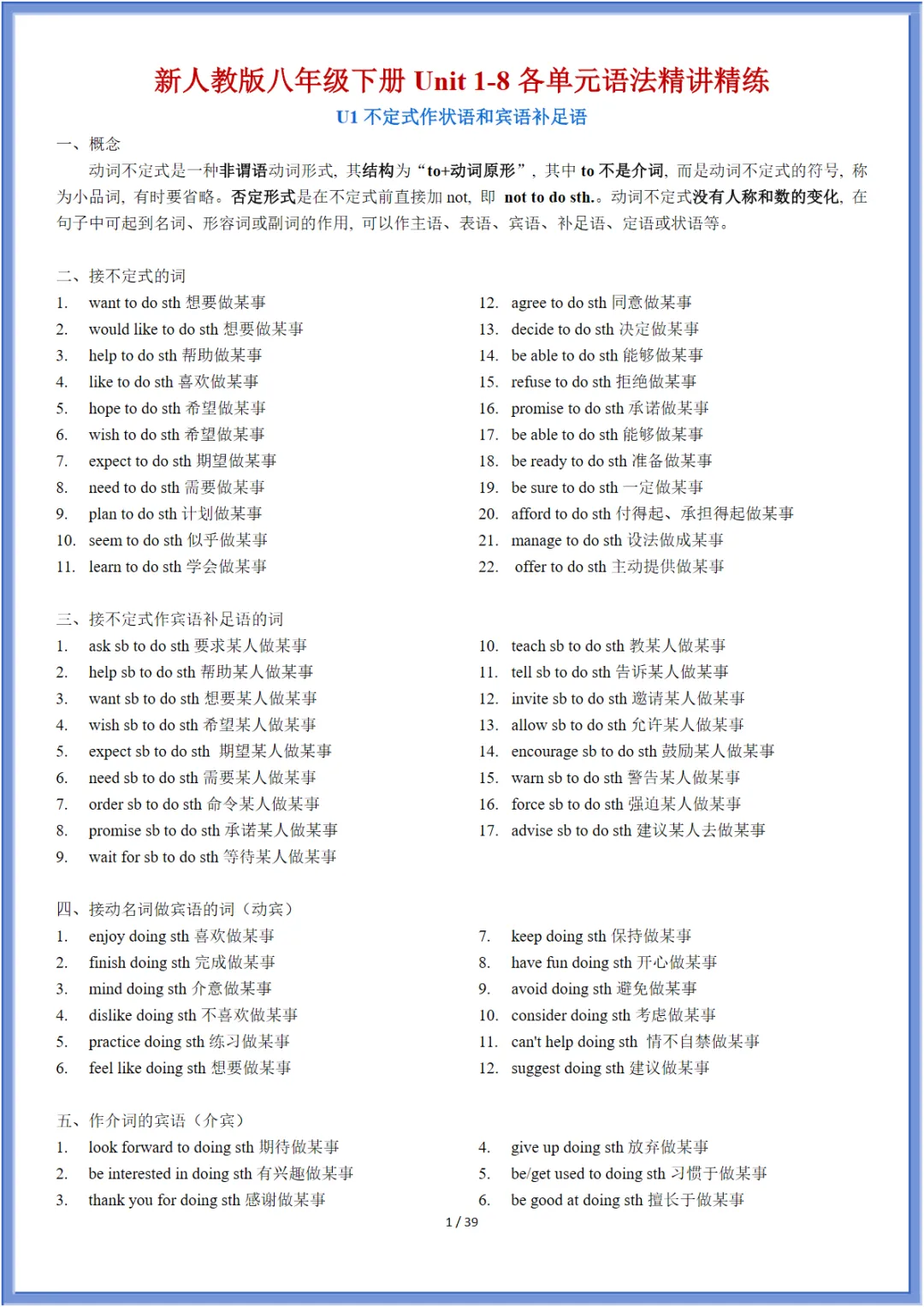 八年级(下)英语 Unit 1-8各单元语法精讲精练