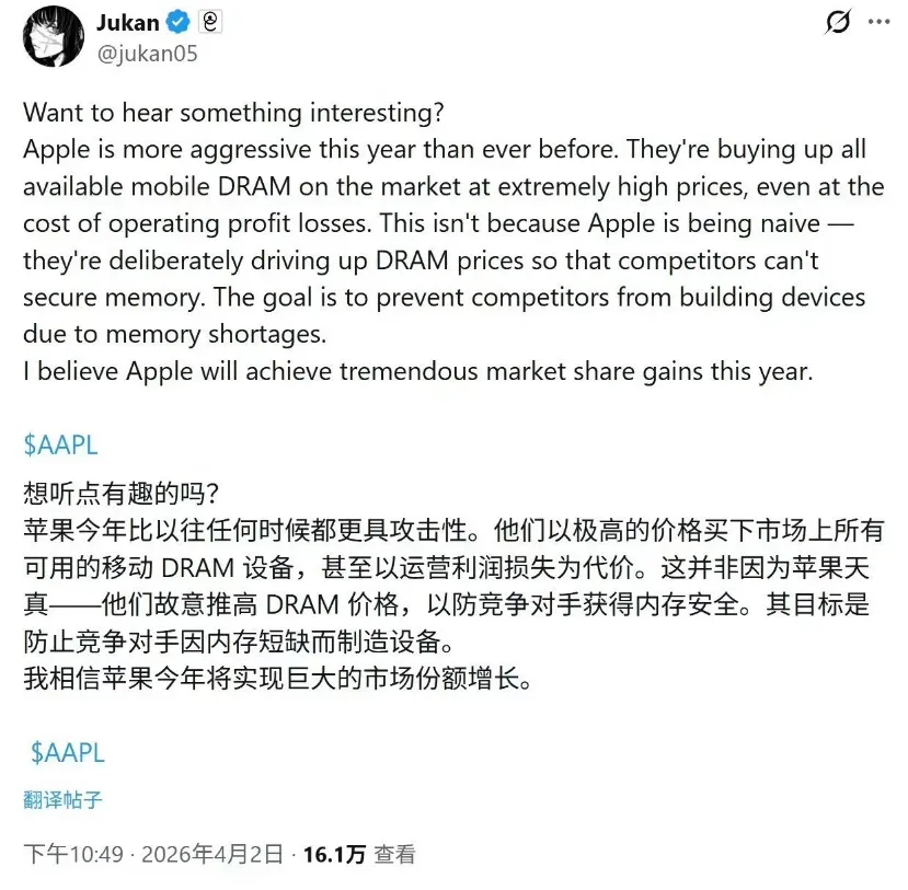 3. 《卡安卓脖子?曝苹果正全球扫货手机内存,牺牲利润也要打压对手》,凤凰网,2026年4月4日