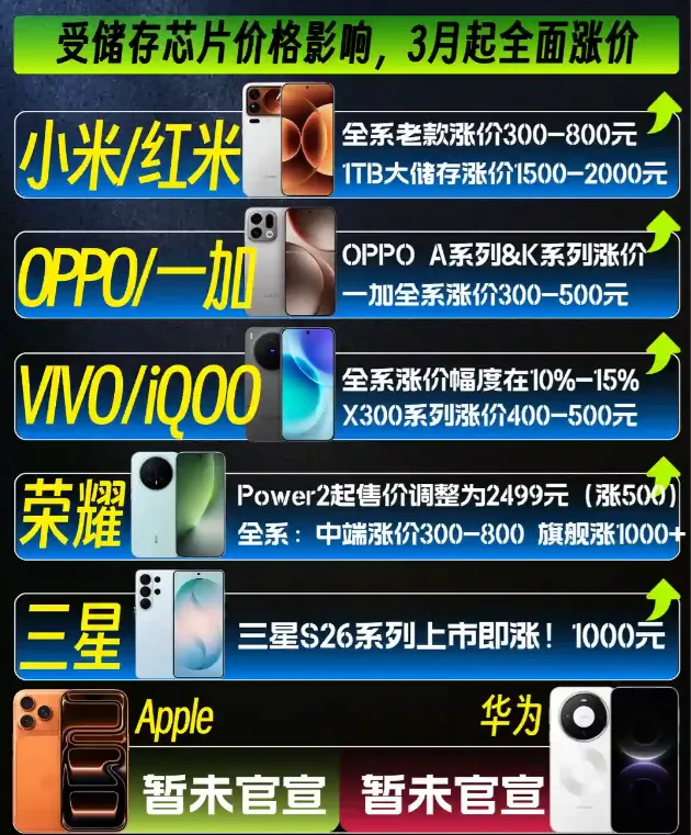 随后,vivo、荣耀、三星也跟着涨价了,至此国内主流安卓品牌大概全都进入涨价状态。