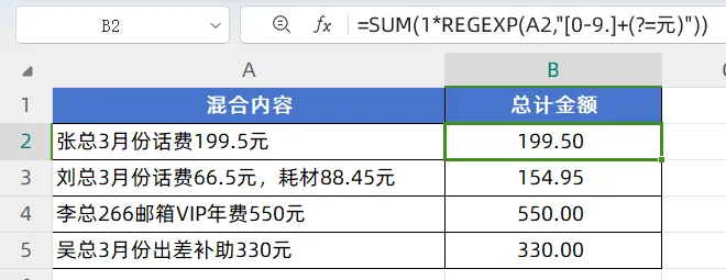 ② 自动提取金额并求和