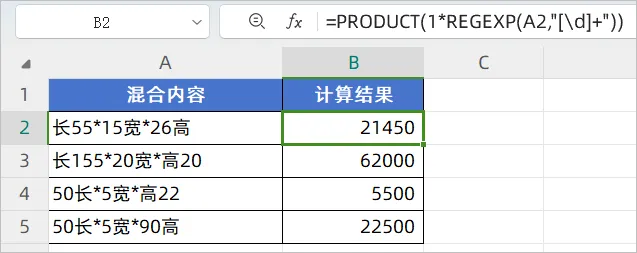 =PRODUCT(1*REGEXP(A2,"[\d]+"))
