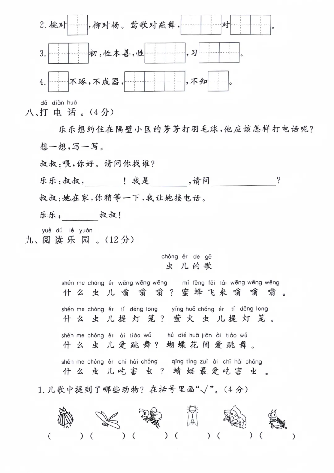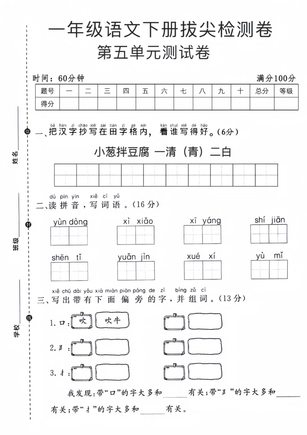 一年级下语文第五单元拔尖测试卷 电子版可打印
