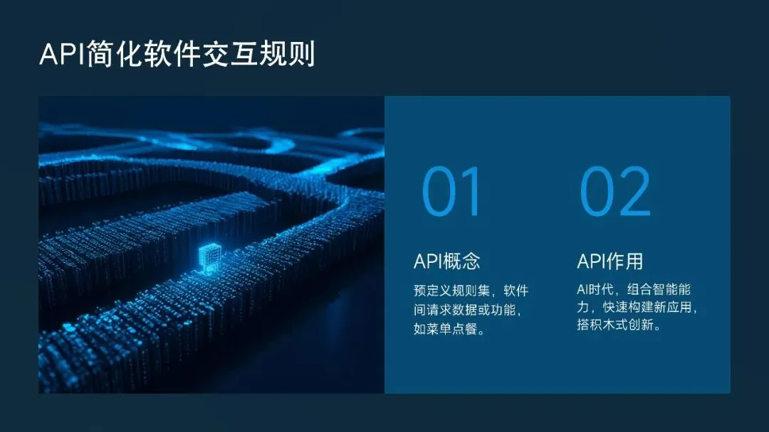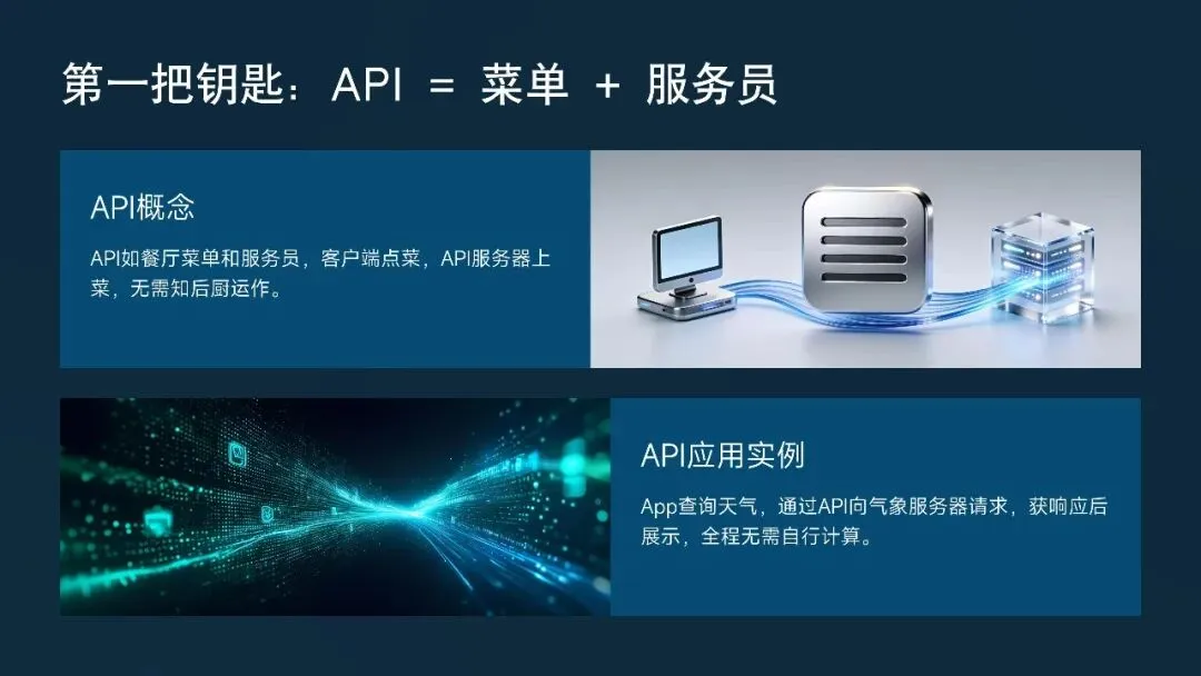 API的全称是“应用程序编程接口”,听起来复杂,但本质很简单:它是一套预先定义好的规则,让一个软件可以向另一个软件请求数据或功能。就像餐厅里,你不需要进后厨炒菜,只需要通过菜单(API)点餐,厨房就会把菜(服务)送出来。在AI时代,API让我们能像搭积木一样,把各种智能能力组合起来,快速构建新应用。