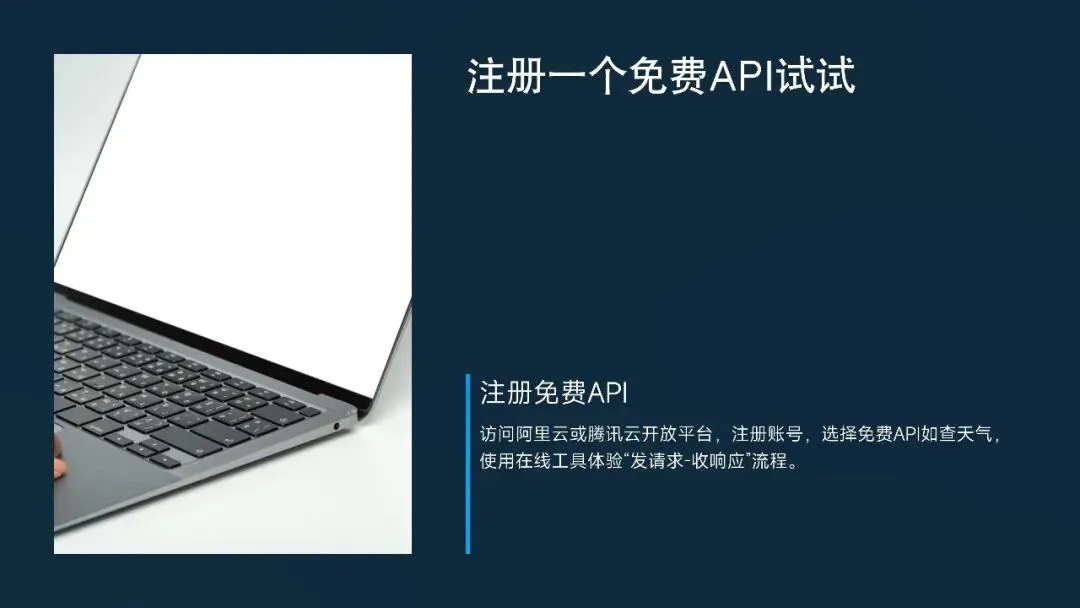注册一个免费API试试:去一些API聚合平台(如阿里云、腾讯云开放平台)注册账号,找一个免费的API(如查天气、查快递),尝试用在线测试工具调用一下。即使不懂代码,也能感受“发请求-收响应”的过程。