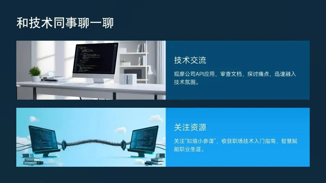 和技术同事聊一聊:请他们演示一个公司正在用的API,看看文档长什么样,问问他们最头疼的是什么。你会很快进入状态。