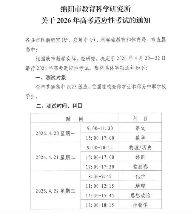 2026年绵阳高三三诊即将开考!考试具体安排如下: