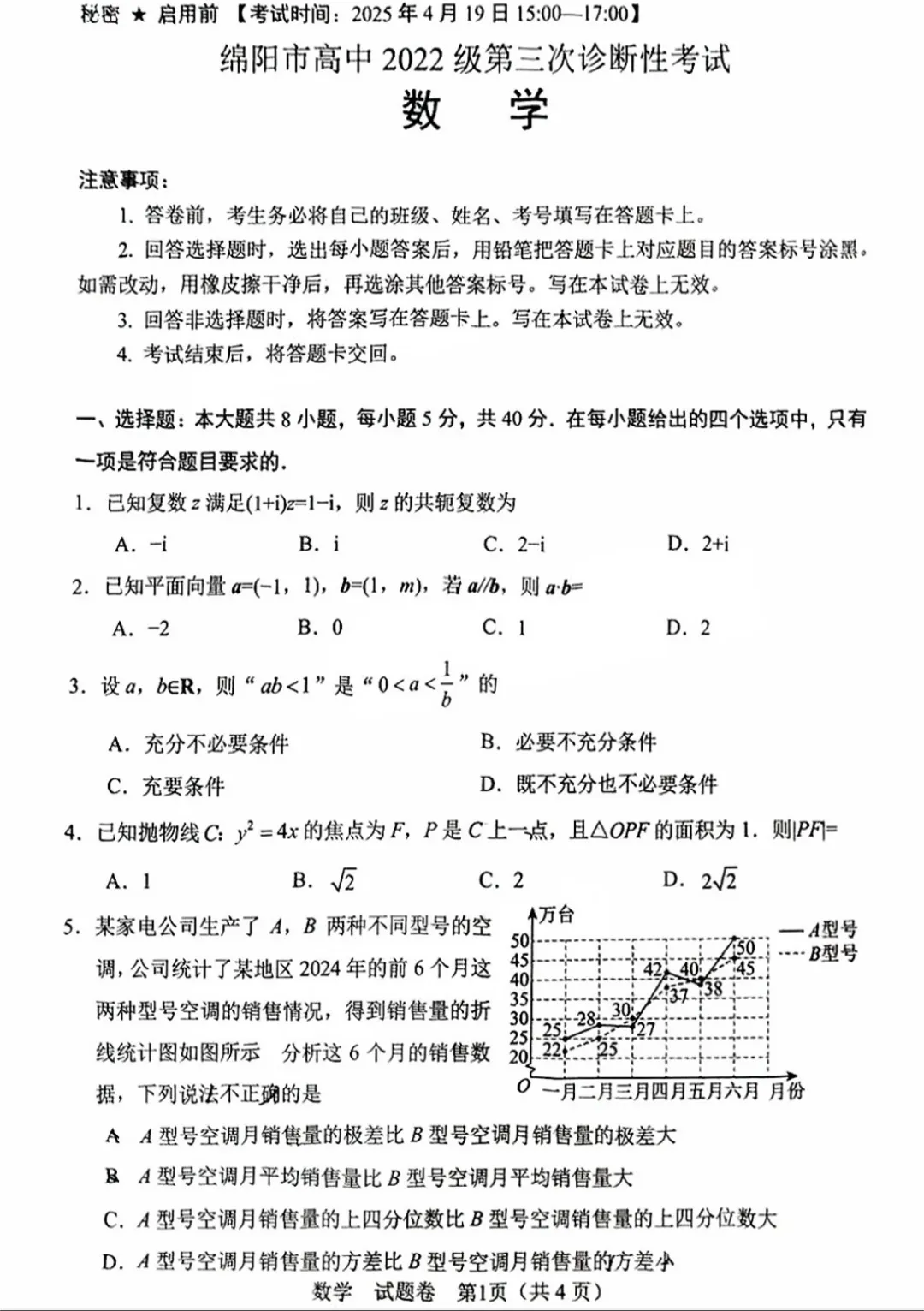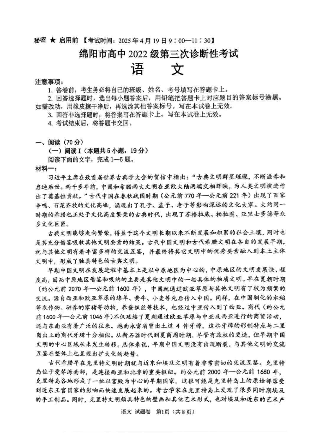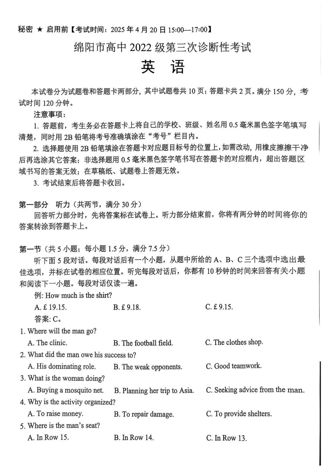 高清可打印!2025届绵阳高三三诊试卷及答案免费领取,A/B卷九科全,含听力