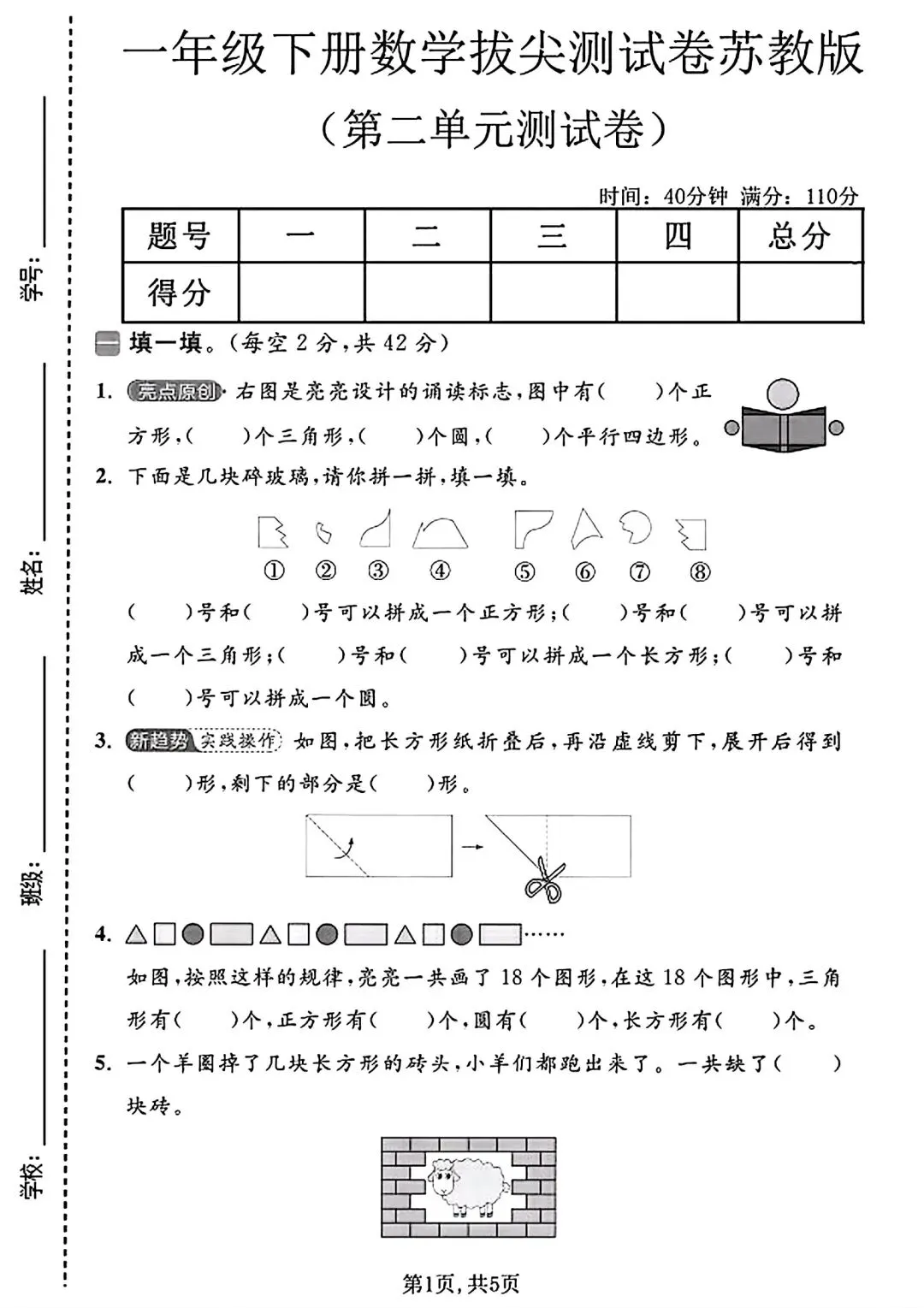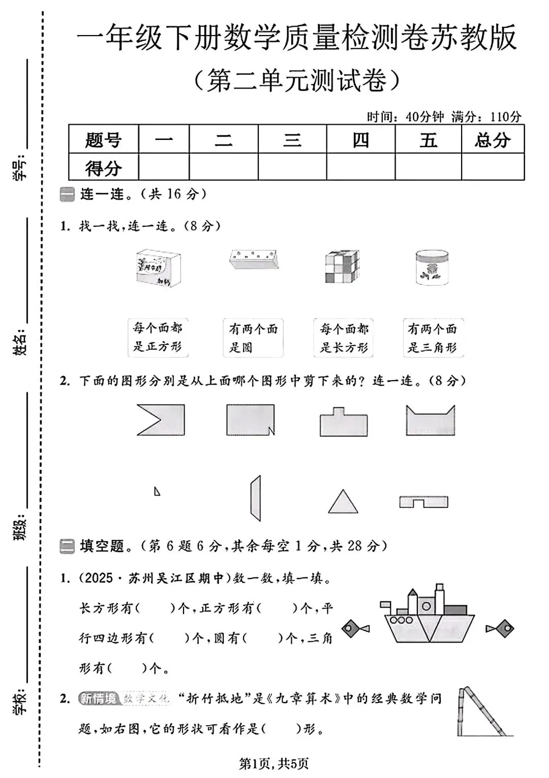 质量检测卷侧重基础图形认知、连线、填空与简单操作,覆盖长方形、正方形、三角形等图形辨识与拼剪,适合日常单元巩固。
