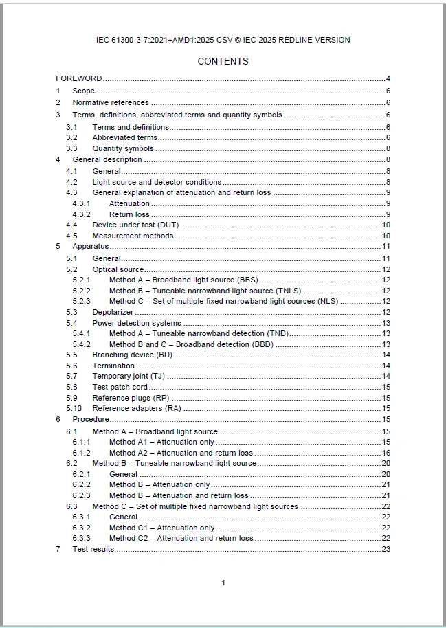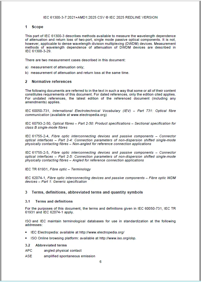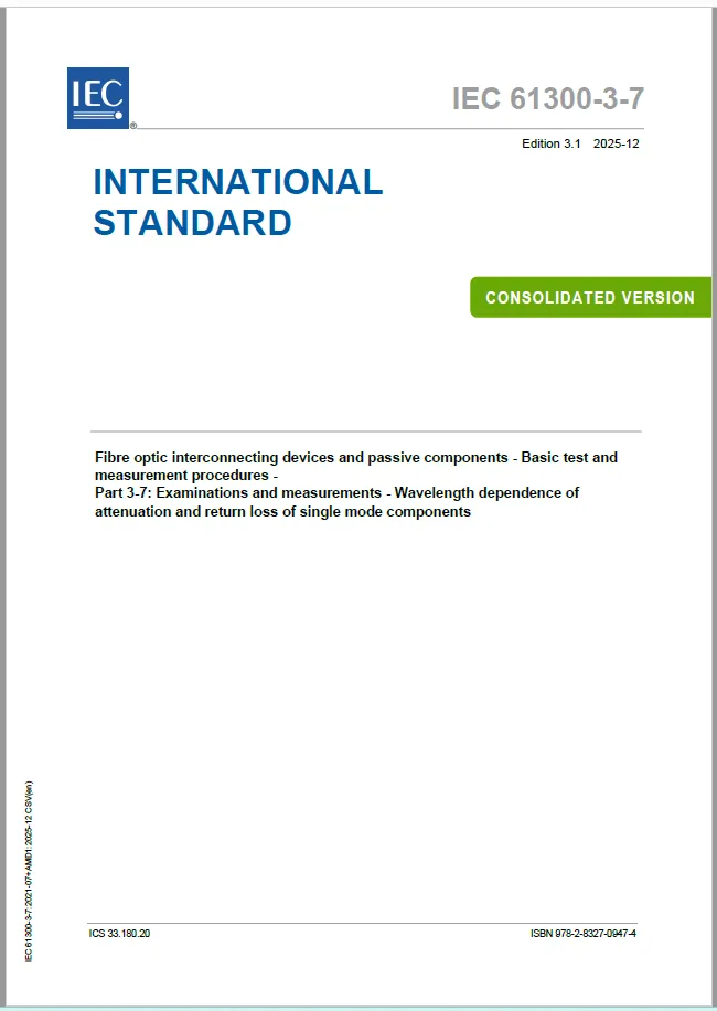 欢迎订购IEC 61300-3-7-2025【PDF原文+中文翻译版】光纤互连器件和无源元件 基本试验和测量程序 第 3-7 部分:检查和测量 单模元件的衰减及回波损耗的波长相关性
