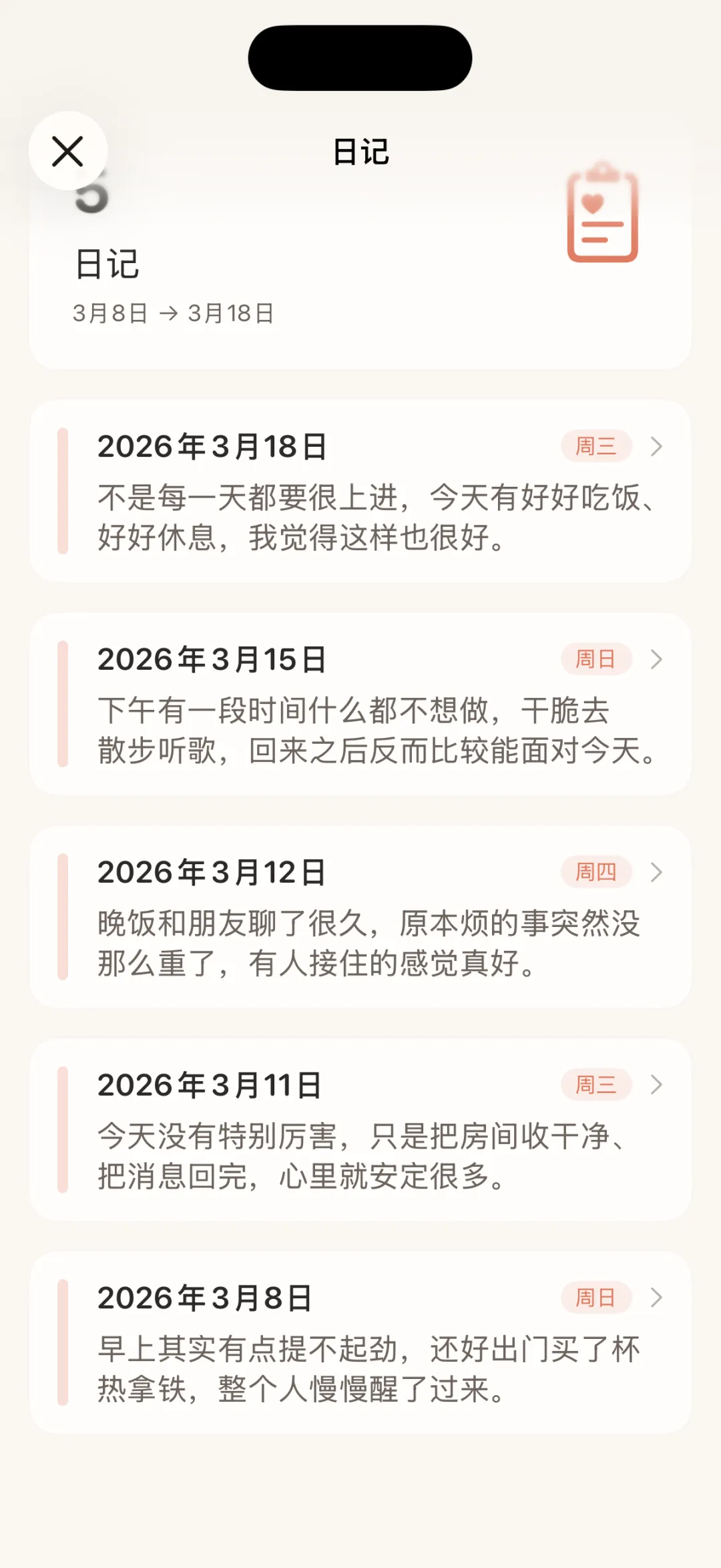 有时候我们真正想留下来的,不只是“我完成了”,而是“我今天是怎么过的”。所以我把日记放进了这个产品里,而且做得很轻。你可以在某一天旁边写下一句短短的话,记下情绪、状态,或者那天发生的小事。