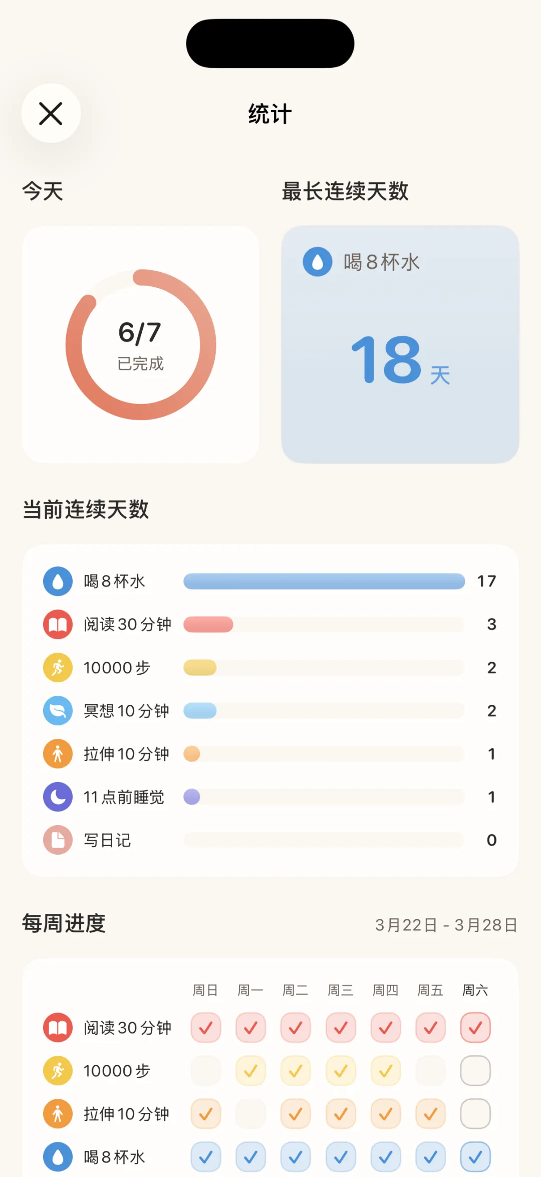 这种感觉很像把一张清楚的进度表放在面前。信息是完整的,但界面是安静的。你不会被过度装饰干扰,也不会被复杂交互拖慢。记录习惯这件事,应该像打一个勾一样自然。