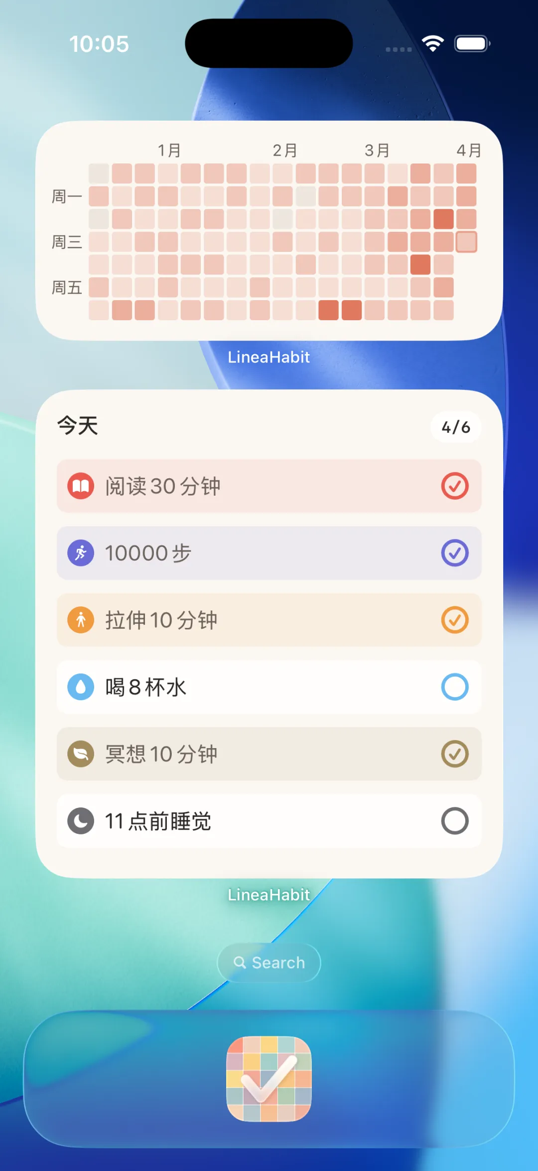 习惯这件事,如果总要专门打开 App 才能想起来,就很容易从生活里滑出去。所以我做了小组件。你不用进入应用,也能在桌面直接看到今天还剩什么、已经完成了多少。有些时候,真正有用的不是提醒你“要更努力”,而是让对的事情一直出现在眼前。