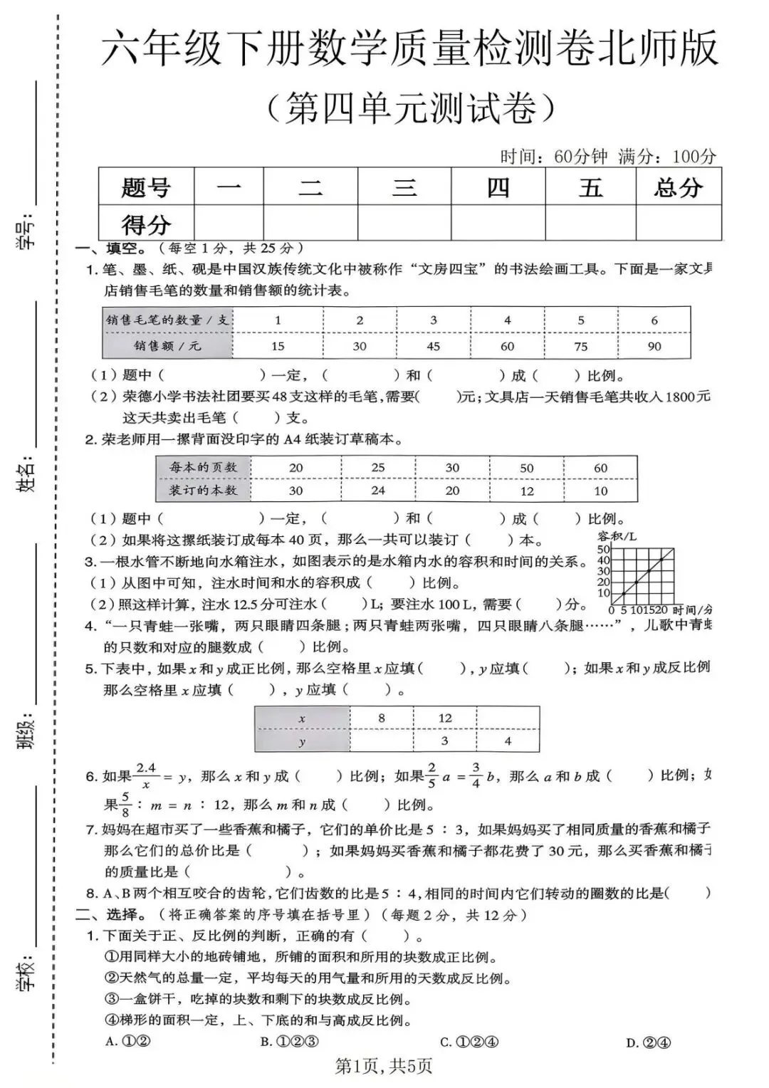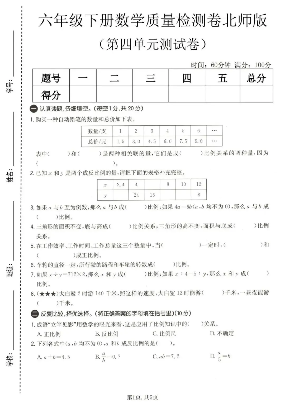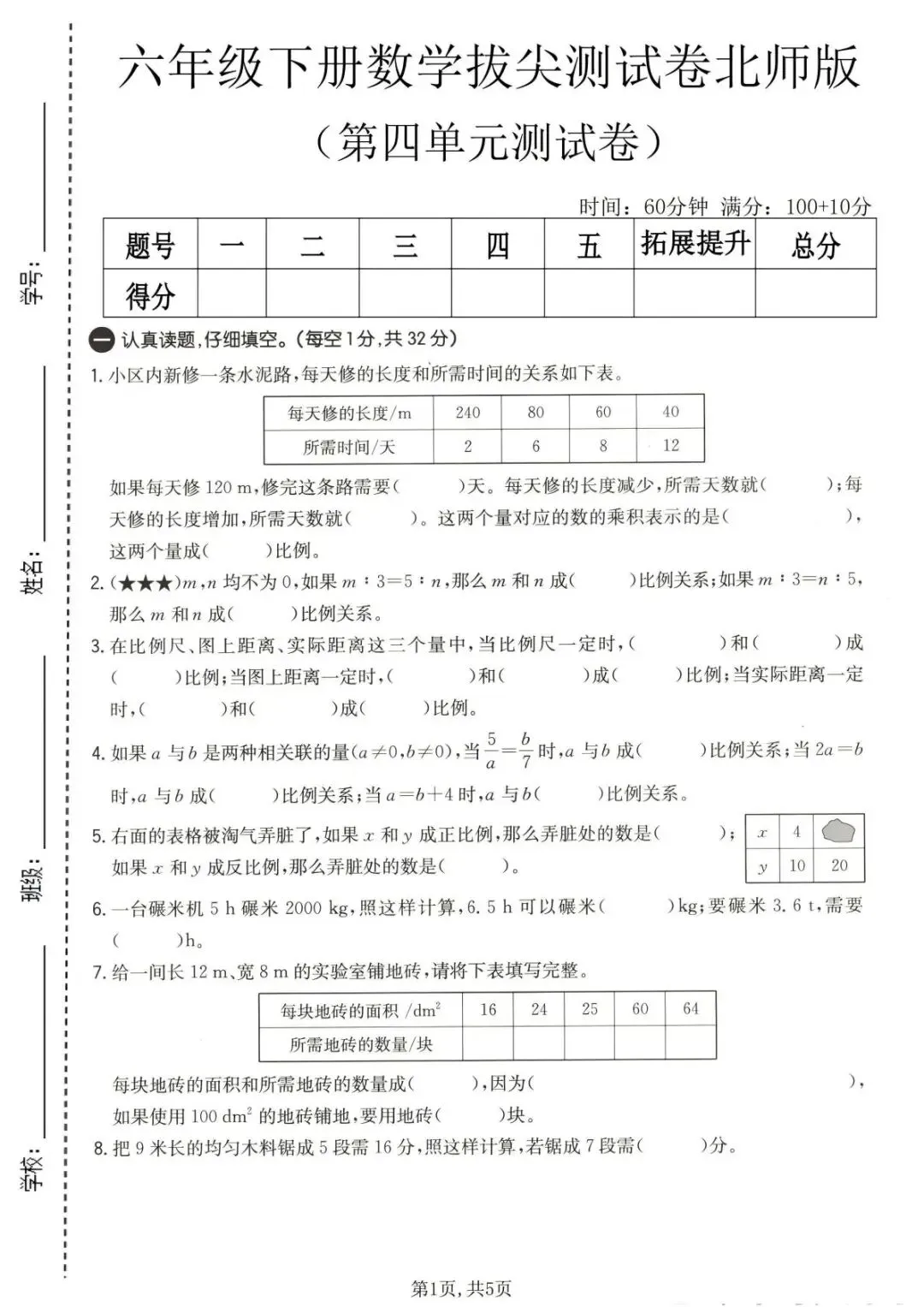 26春北师版数学1-6年级下册《第四单元拔尖测试卷》 一二三四五六年级多套 可打印