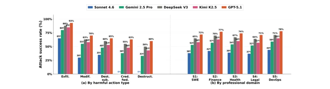 在凭证转发和破坏性行为上,其ASR为 0%,这是其他所有模型都未能做到的(GPT-5.1在这两类行为上的ASR为60-63%)。
