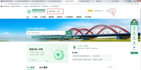二、进入后,区划选到“霍林郭勒市”,并点击“登陆”。可直接输入账号密码登录也可以通过蒙速办APP扫码、国家政务服务平台、电子社保卡扫码登录。