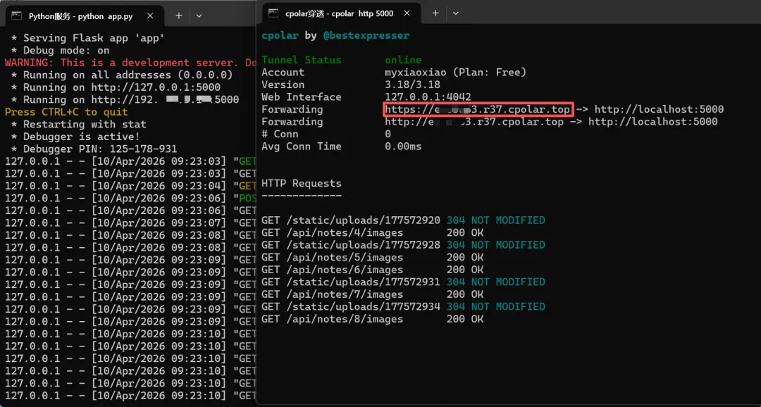 cd /d D:\note_web:: 先杀掉所有已运行的cpolar进程,解决并发限制taskkill /f /im cpolar.exe >nul 2>&1:: 打开第一个独立窗口:运行 Pythonstart "Python服务" cmd /k "python app.py":: 打开第二个独立窗口:运行 cpolarstart "cpolar穿透" cmd /k "cpolar http 5000"exit