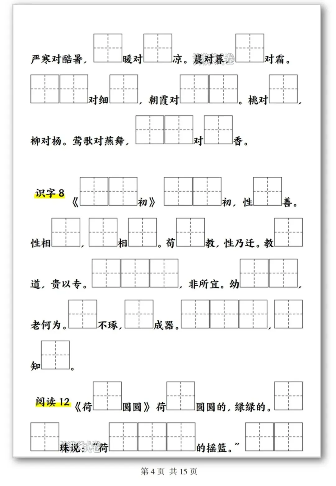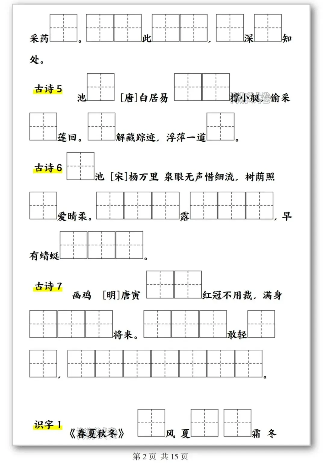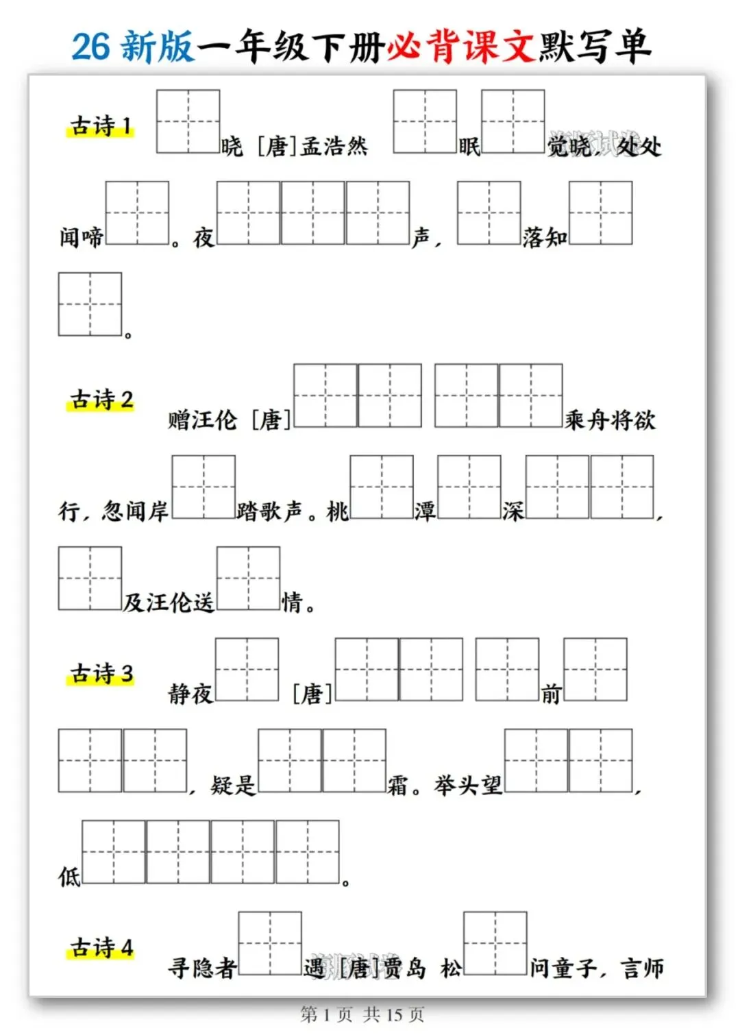 今天为大家分享一年级下册语文【必背课文默写单】,古诗 + 识字全覆盖,排版清晰、重点突出,孩子👦每天练一练,背诵默写🖋️两不误。不用到处找资料,一份搞定课后复习和考前冲刺,省心又高效~真心推荐给每一位一年级家长!
