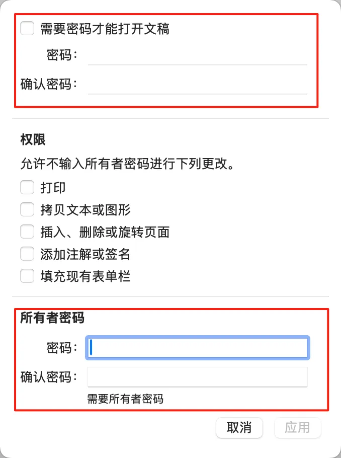 打开文档密码:没有设置这个密码的时候,可以正常打开PDF文档,但是无法修改PDF文档,也就是文档只有可读权限。如果设置了这个密码,打开PDF文档的时候,就需要输入密码才能打开文档。 -