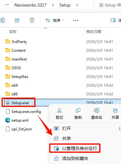 8.返回之前解压的“NavisWorks 2027”文件夹,依次打开“Crack——AdskUAT_1.3.4.0”文件夹,选中“AdskUAT.exe”文件,鼠标右键选择“以管理员身份运行”