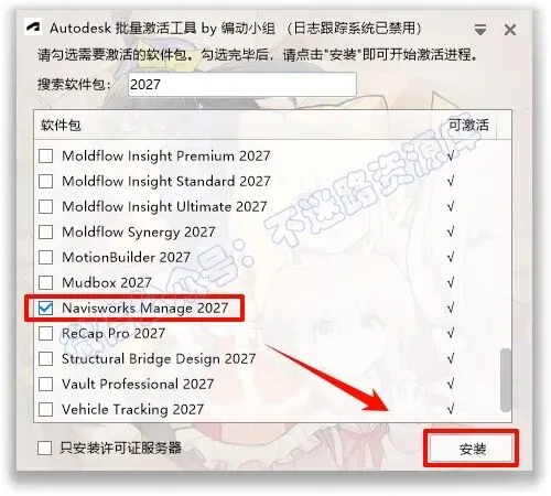 9.勾选“NavisWorks Manage 2027”,点击“安装”
