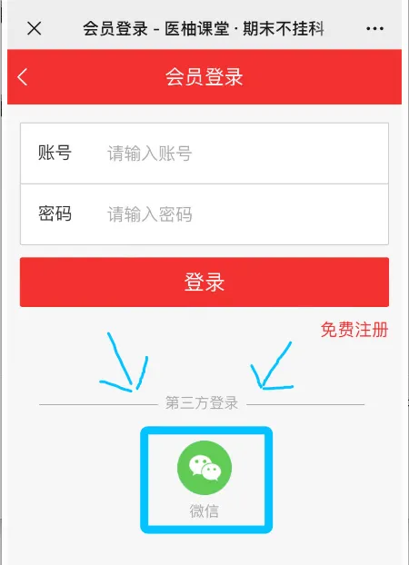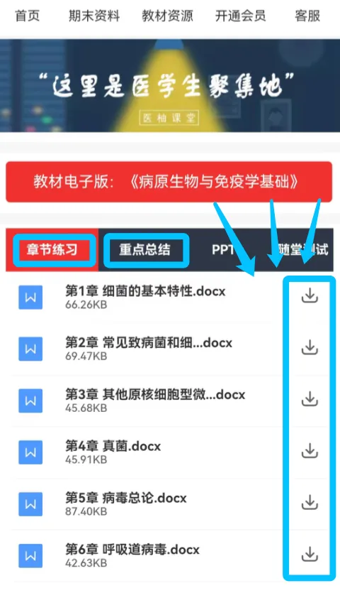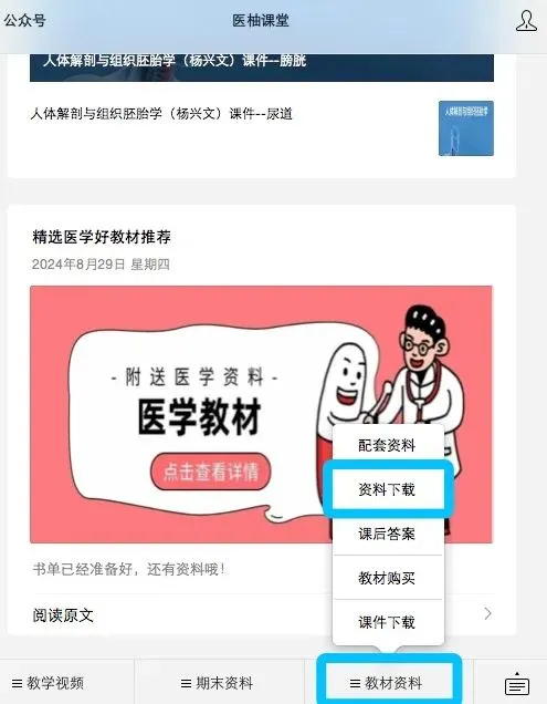 在医柚课堂公众号主页,点击“教材资料”菜单栏里的“资料下载”。跳转后选择微信登录,找到要下载的教材进入即可进行下载。