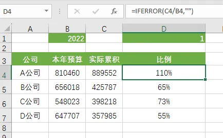 首先用公式计算出进度百分比,我们使用IFERROR函数: