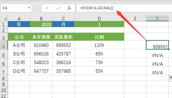 使用公式:=IF(D4>1,C4,NA())