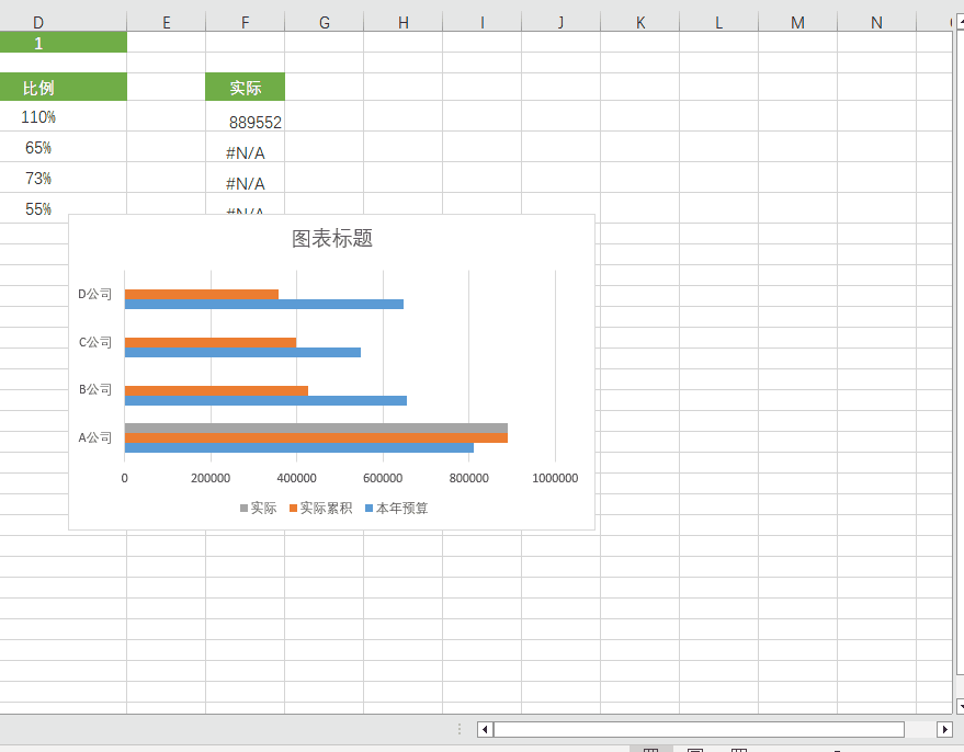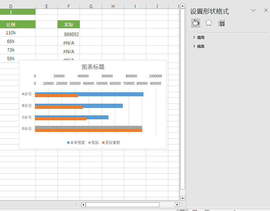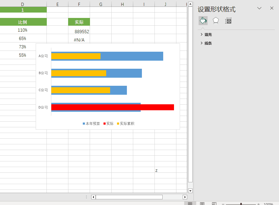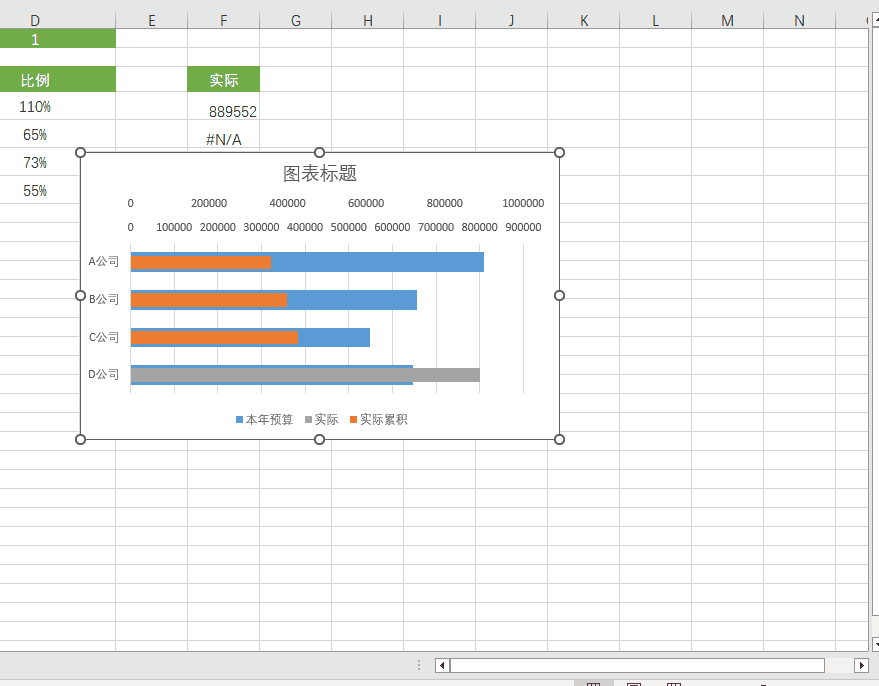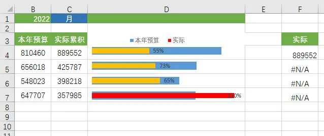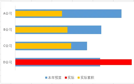 调整数据条,把预算数据条加粗,然后把实际累计的系列重叠设置为100%,