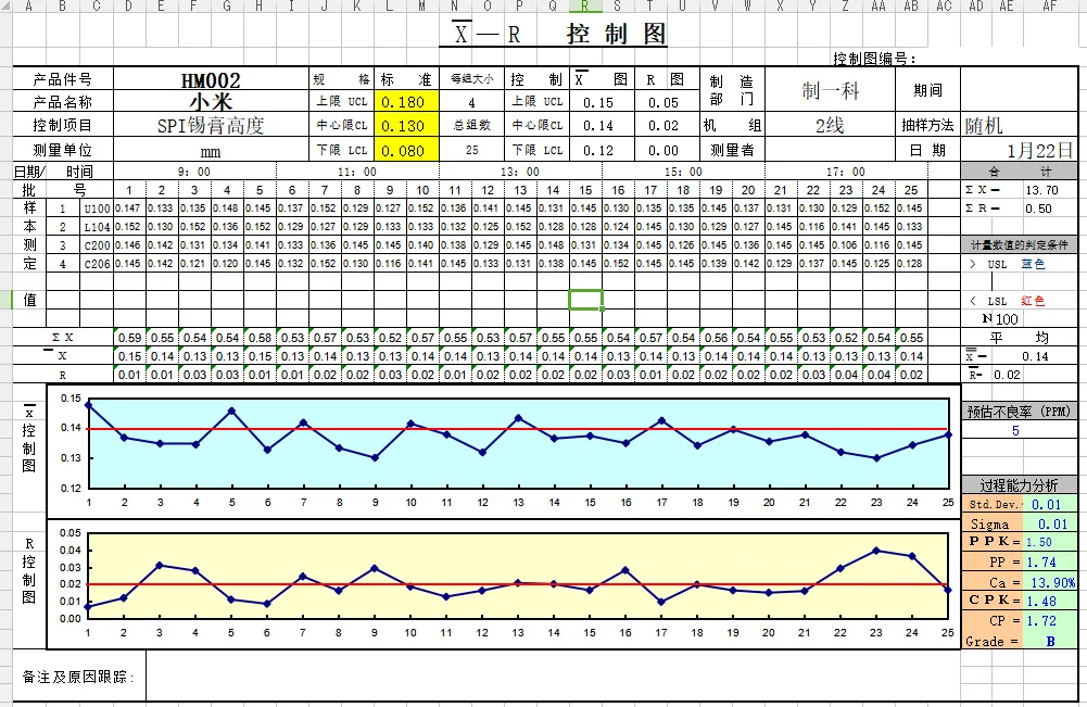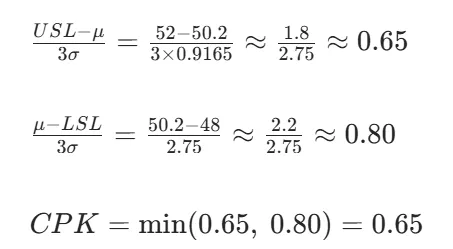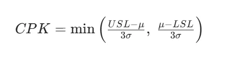 CPK怎么算?分享一份CPK自动计算EXCEL表.xlsx–实用表单模板 质量文库:质量人的资料库 CPK怎么算? CPK(制程能力指数)直接给你最简公式 + 一步一步算,不用记复杂推导。 一、CPK 计算公式 CP(潜在能力)CP=6σUSL−LSL CPK(实际制程能力)CPK=min(3σUSL−μ,3σμ−LSL) 符号说明: USL :规格上限 LSL :规格下限 μ :样本平均值 σ :样本标准差(一般用整体标准差,分母 n,不是 n-1) 二、一步一步计算示例 假设: 规格:50±2 → USL=52,LSL=48 测量 10 个数据:50, 51, 49, 50, 50, 52, 49, 50, 51, 50 1. 求平均值 μ 总和 = 502μ=502÷10=50.2 2. 求标准差 σ 用整体标准差公式: 算出:σ≈0.9165 3. 算 CPK 3σUSL−μ=3×0.916552−50.2≈2.751.8≈0.653σμ−LSL=2.7550.2−48≈2.752.2≈0.80CPK=min(0.65,0.80)=0.65 三、CPK 结果怎么判 CPK < 0.67:制程能力严重不足 0.67 ~ 1.00:一般,需改善 1.00 ~ 1.33:尚可 1.33 ~ 1.67:充分,稳定 >1.67:制程能力优秀 CPK自动计算EXCEL表.xlsx 质量文库:资料获取 点下方阅读原文,下载学习资料!
