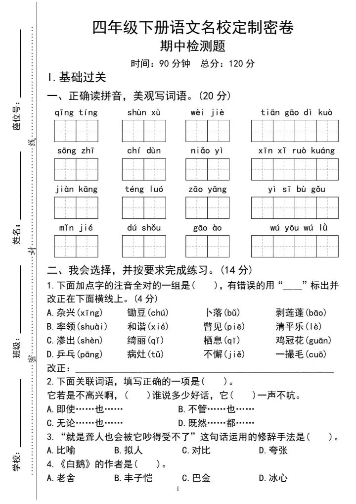 四年级下册语文期中测试卷合集含答案(完整电子版可打印)