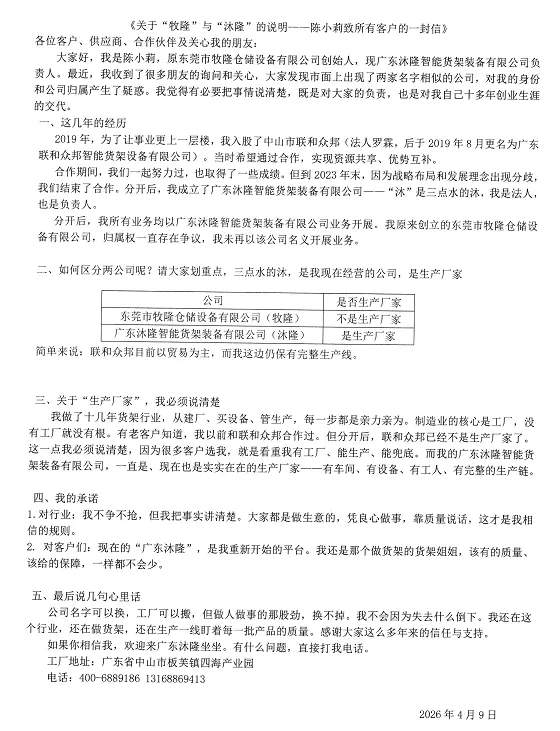 《关于“牧隆”与“沐隆”的说明——陈小莉致所有客户的一封信》