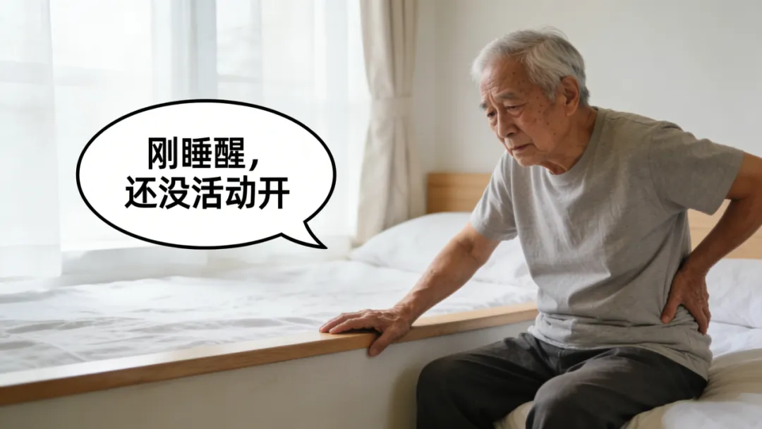 信号2:起床时手撑床早上起来,先侧身、手撑着床、慢慢才能坐起来。问就是“刚睡醒,还没活动开”。