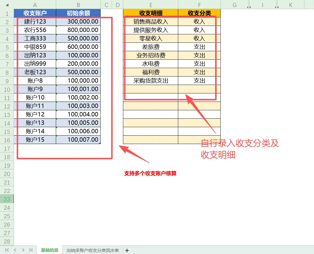 在“基础信息”工作表中,您可以录入各收支账户的名称及初始余额。这一步是后续核算的基础,确保每个账户的起始资金准确无误。例如,您可能有建行、农行、工行等多个银行账户,以及一些现金账户等,都可以在此一一设置。