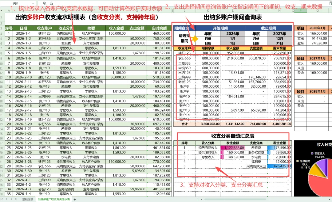 出纳多账户收支分类流水核算表 Excel表格模板 -使用说明