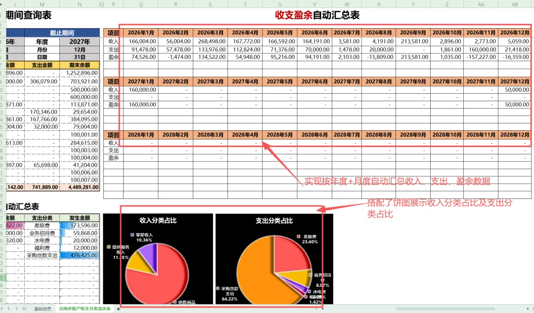 “收支盈余自动汇总表”会按年度和月度自动汇总收入、支出和盈余数据。通过这个表格,您可以直观地看到每个月或每年的资金结余情况,掌握财务状况的整体趋势。