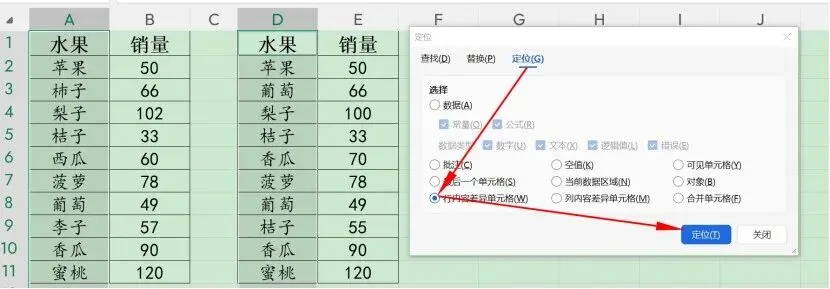 操作步骤:按住Ctrl不放,依次单击两列要核对的数据(如下图的A列和D列或者B列和E列),再按F5或者Ctrl+G打开【定位】,勾选【行内容差异单元格】,再点击【定位】即可,有差异的数据就会立刻显示出来。