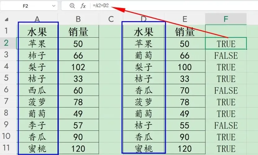 操作步骤:在两列数据旁边的空白列输入公式,例如对比下图的A2和D2,则输入公式=A2=D2。再按回车键,会出现TRUE或者FALSE,TRUE代表相同,FALSE代表不同。