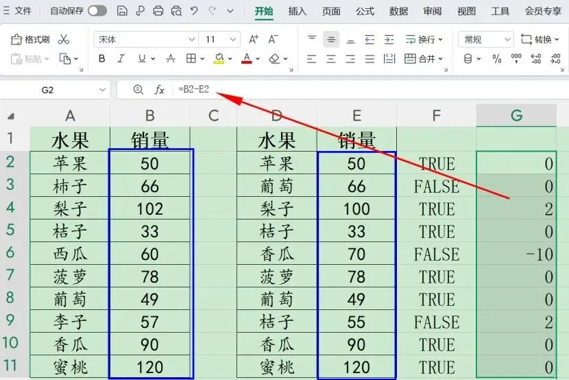 也有朋友喜欢将数字不用这类等式做比较,而是用减法,比如上面的B列和E列,则输入公式=B2-E2,再按回车键。结果是0,则表示相同,结果不是0,则表示不同。