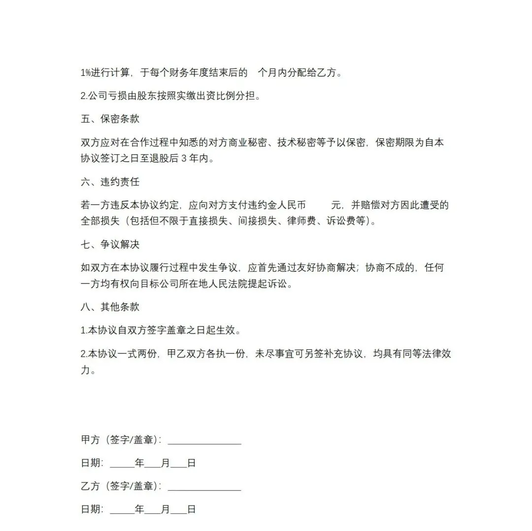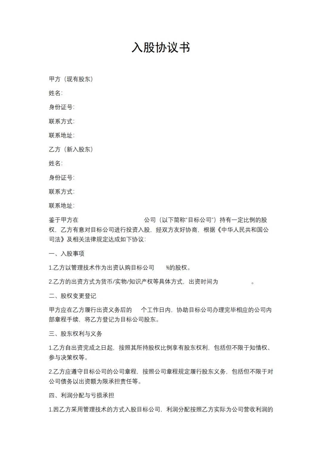 入股协议书模板,WORD文档电子版,可免费下载打印
