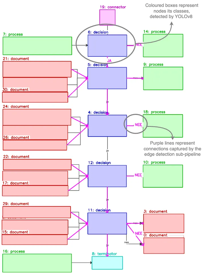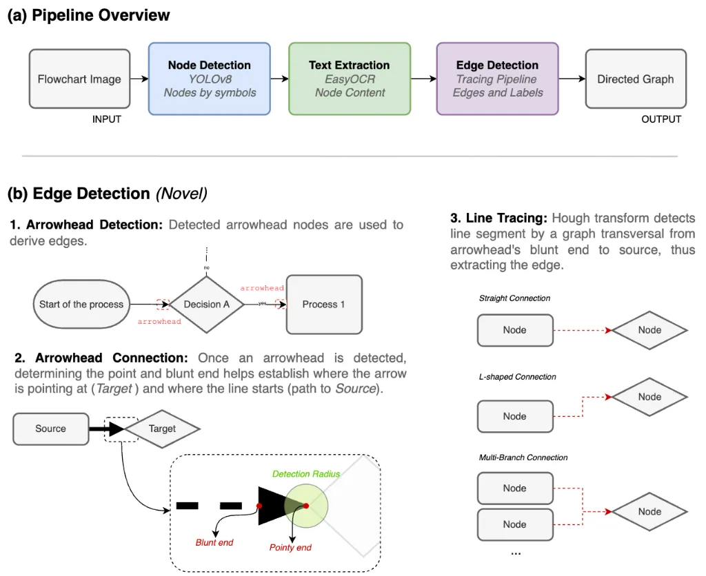 来看流程图解析的一个方案,面向ISO 5807 标准工业维护流程图的流程知识结构化提取开源纯cv pipeline【视觉语言模型在节点与文本检测尚可,但连接拓扑重建能力很弱,F1值低于0.30】,主要针对的场景是PDF/扫描版维修流程图设计【注意:主要解决的是维修/故障流程图,通用流程图适配有限,指标也不高,纯cv方式】,《FlowExtract: Procedural Knowledge Extraction from Maintenance Flowcharts》,https://github.com/guille-gil/FlowExtract,https://arxiv.org/pdf/2604.06770,核心思路是节点检测->文本提取->边提取三阶段。
