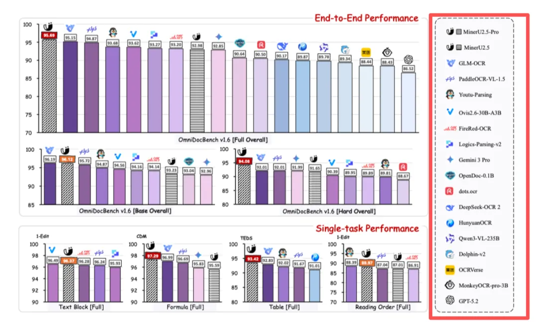 继续看文档解析领域多模态方向,MinerU2.5-Pro更新,主要特点是保留MinerU2.5的1.2B参数架构,主要改动点是训练数据从不足1000万页扩至6550万,可以再回顾下这块的内卷形势: