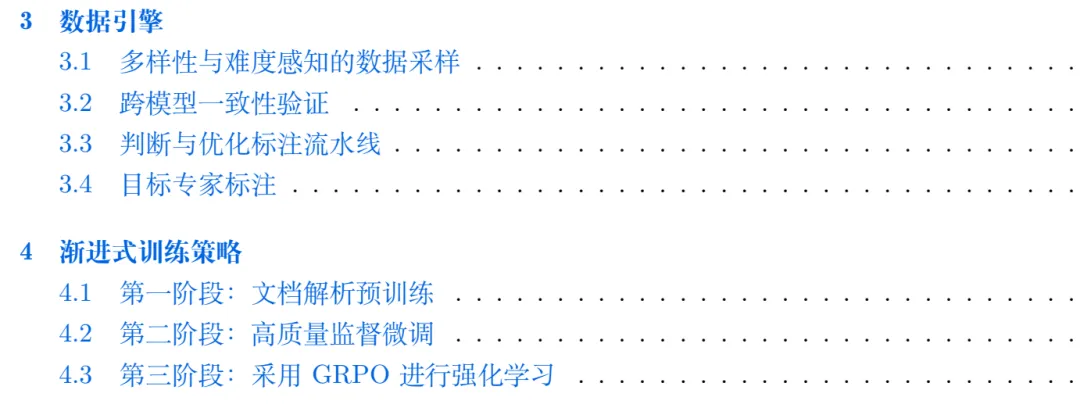 ->Step3.GRPO强化学习对齐(Stage3),使用19.2万标注样本,以文本编辑距离、公式CDM、表格TEDS、布局IoU为直接奖励。