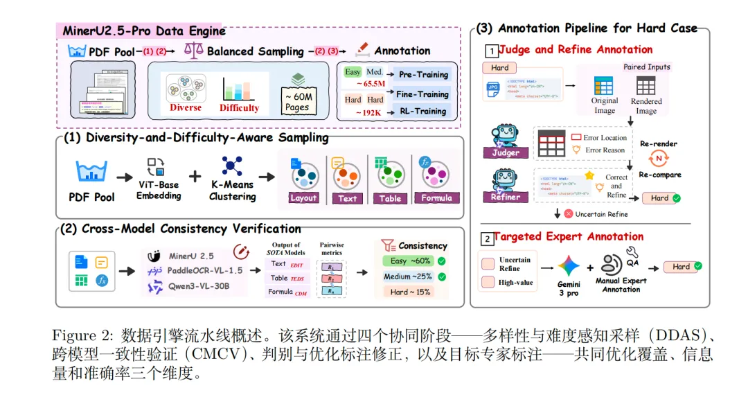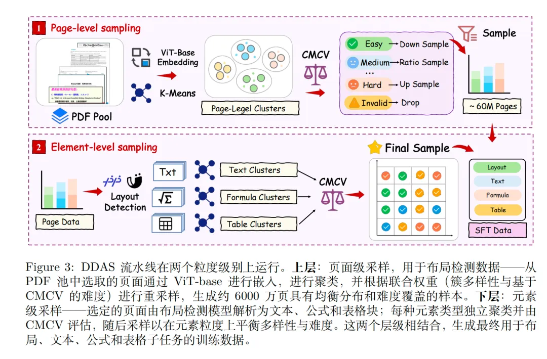 Step1.多样性与难度感知采样(DDAS),先对全部PDF页面做ViT-Base嵌入+K-Means聚类,再做页面级与元素级双粒度采样;简单簇下采样、困难/小簇上采样,纠正长尾分布偏移,最终把训练数据从不足1000万页扩充到6550万页,覆盖复杂嵌套表格、稠密公式、非常规版式等高难度场景;