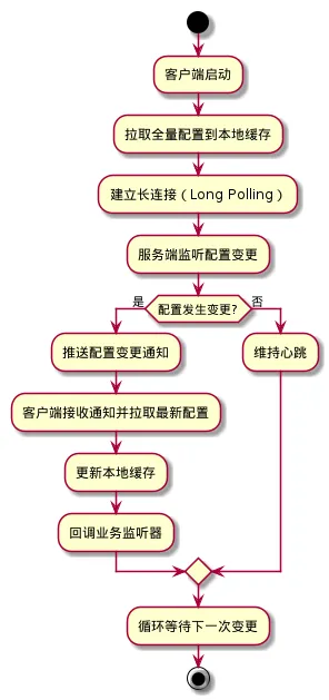 这个流程图完整的展示了从客户端启动、建立长连接、服务端监听变更到推送通知、客户端拉取更新的全流程,帮助你快速理解整个配置推送的逻辑。